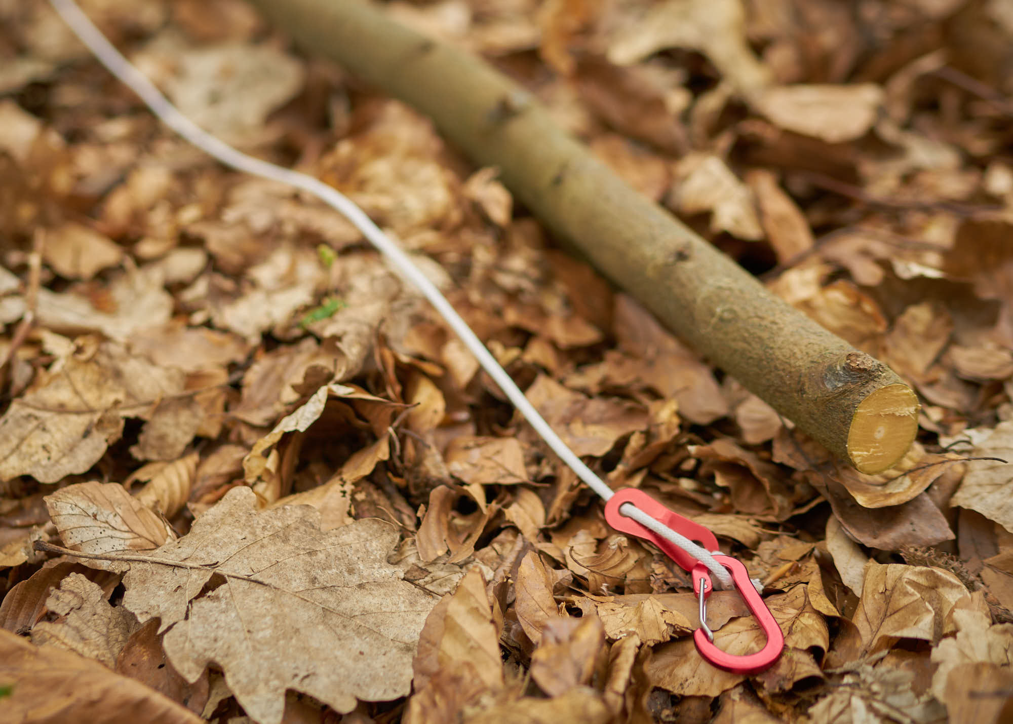 Es wird mit einem 135 cm Trekkingst0ck und 6 Heringen aufgebaut. Wahlweise können dafür natürlich auch Hölzer aus dem Wald verwendet werden.