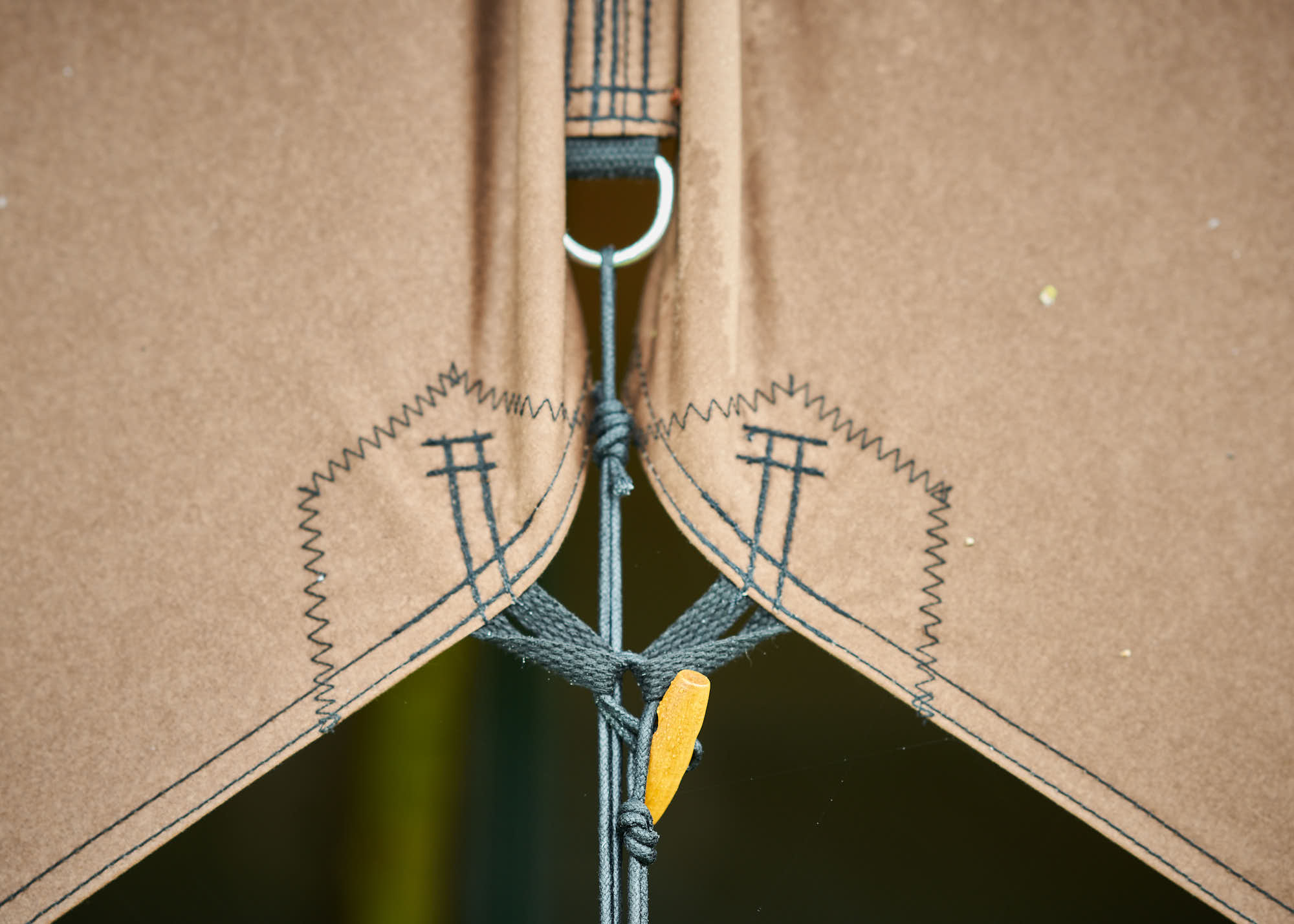 Die Verbindung an der Spitze wird mit zwei D-Ringen weitgehend geschlossen oder mittig für eine Top-Lüftung geöffnet. So kann man gemeinsam unter einem regensicheren Dach kochen oder jeder kann für sich sein Lager aufschlagen.